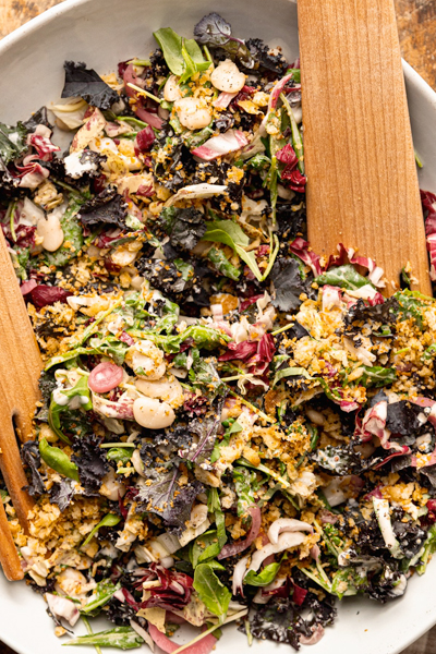 Toasted pumpkin seeds, grape tomatoes, shredded carrots, roasted pep- pers, pear and mango slaw, goat cheese, balsamic honey dressing